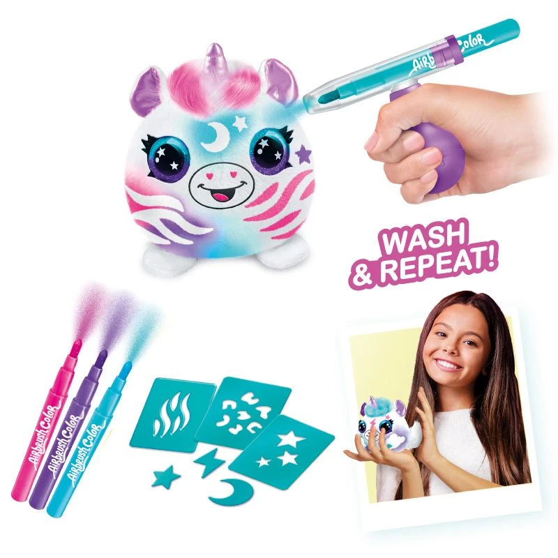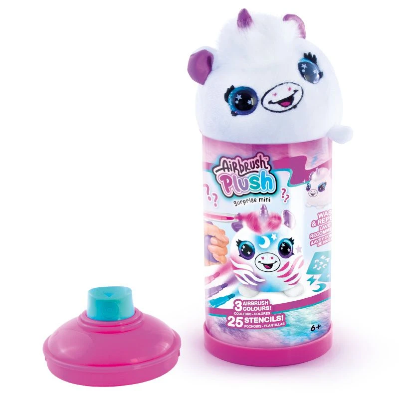 Sett farge på plysjen din! Bruk spraypumpen for å gi plysjen et helt unikt design. Du kan velge å bruke malene for å få ikoner i fine farger på plysjen, eller være kreativ og kjøre på med freestyle. Det er bare å feste malene på kosedyret, velge en farge og spraye på – og når du er klar for et nytt design, vasker du bare kosedyret og begynner på nytt med ny pynt. Det er 6 mini-plysj å samle på, og du ser først hvilken du får når du åpner esken.