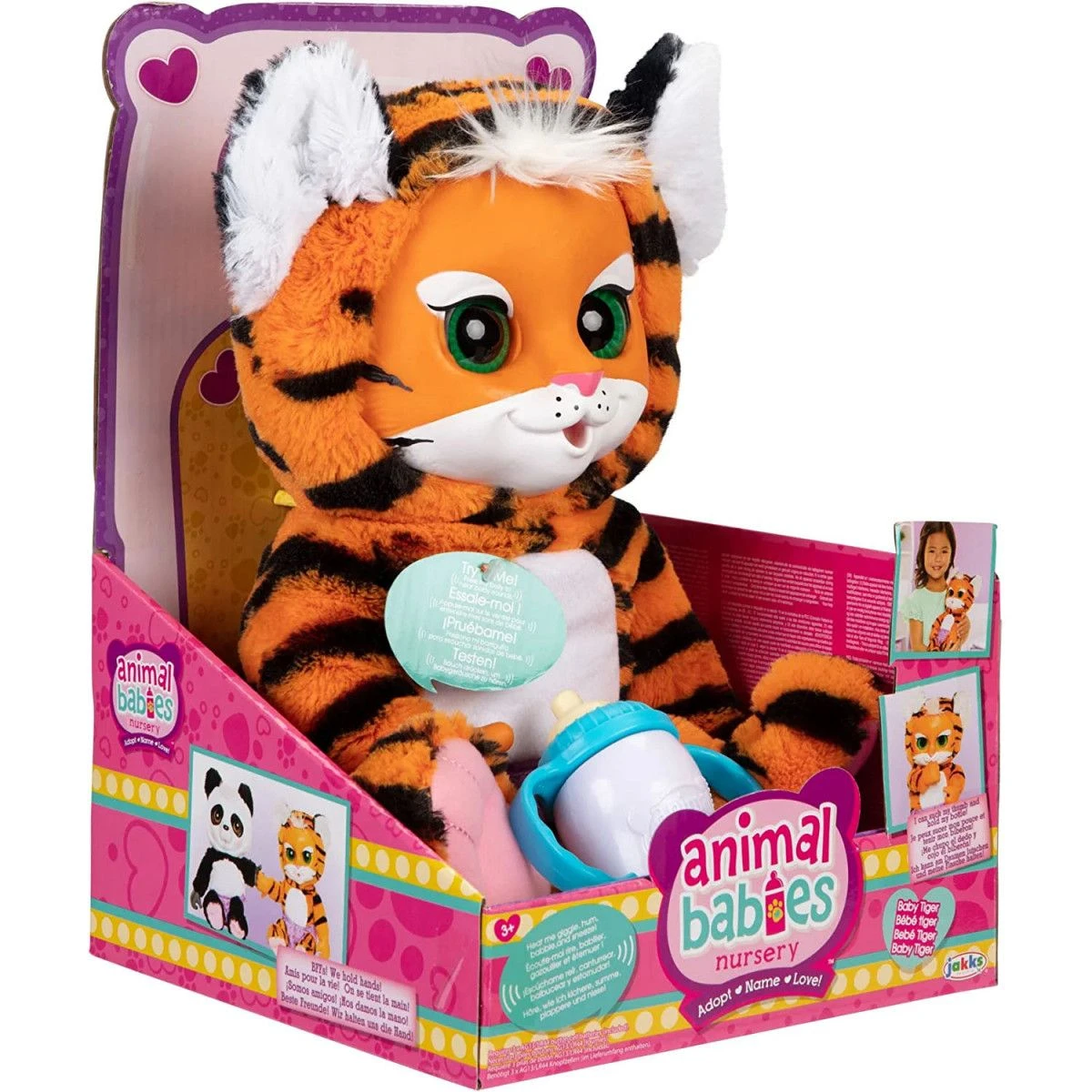 Animal Babies Nursery er den søteste samlingen av babydyr for barn å navngi, elske og pleie akkurat som en ekte baby! Med en høyde på omtrent 35 cm med myk pels og kosete kropper, er de den perfekte hyggelige følgesvenn. Spesialdesignede hender lar babyer suge tommelen, holde smokkene og til og med holde hender med alle andre Animal Babies Nursery dyr!