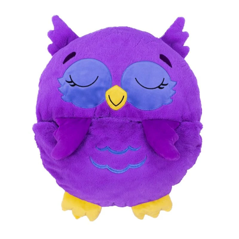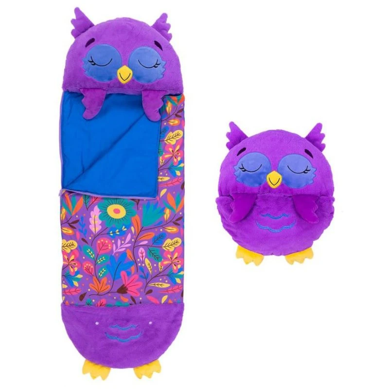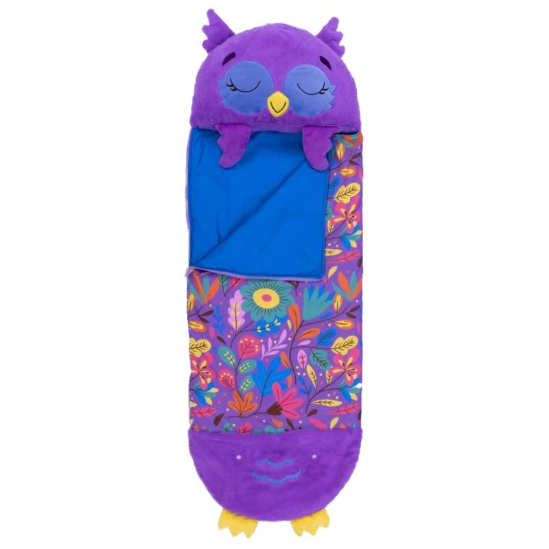 - Happy Nappers uglen kommer i en lilla farge med en blomster sovepose.
