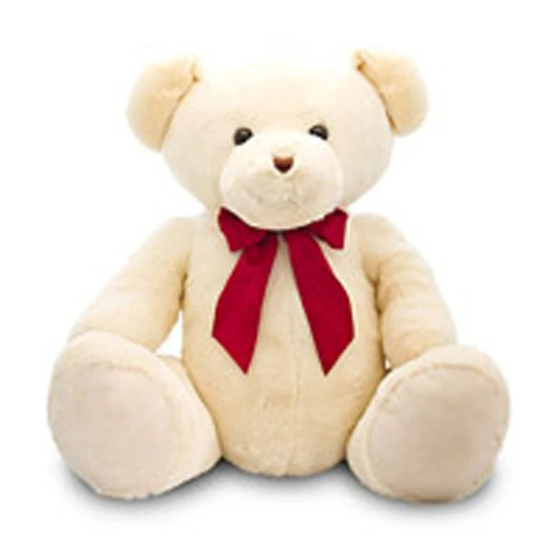 Herlig og kosete teddybjørn med myk hvit pels, koselig fjes og sløyfe i halsen.