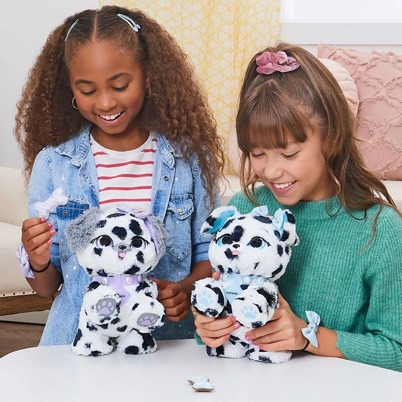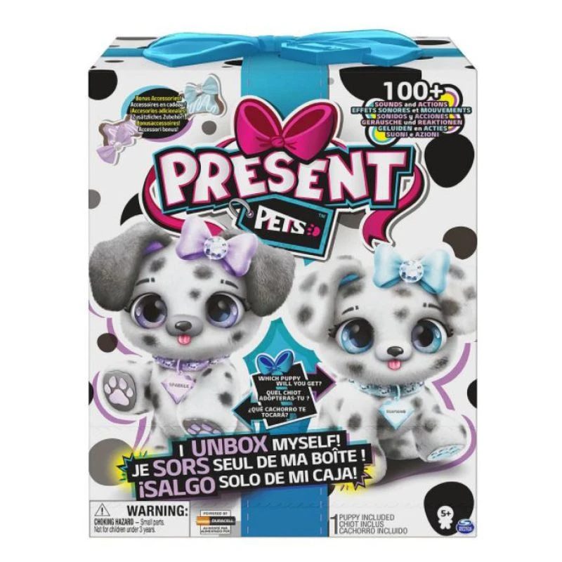 Visste du at Present Pets er det eneste kjæledyret som pakker opp seg selv? I gaveesken venter den søteste interaktive hundevalpen du har sett. Den søte valpen kan ikke mente med å møte deg, så hun kjemper seg ut av gaveesken sin. Du kan bare vente, så kommer hun ut til deg for å leke. Det finnes to ulike Present Pets Rainbow Glitter-valper – og du vet først hvilken du får når hun bryter ut av esken sin. Får du Casey eller Kakao? For å finne ut av hvem som gjemmer seg i esken, fjerner du det ytterste laget og trekker i gavemerket. Kassen begynner deretter å riste, fordi valpen vil ut til deg. Gaveesken åpner seg og den kommende bestevenn viser seg. Din Present Pets har store skinnende øyne, en myk kropp som inviterer til en klem og fine detaljer på poter, ører, halsbånd og sløyfe. Hun er den søteste lekehundevalpen! Når hun kommer ut av gaveesken, synger valpen din en spesiell åpningssang! Opplev kjæledyrets personlighet når dere leker sammen – du vil elske den livlige karakteren hennes. Din Present Pet elsker å kose! Stryk en hånd over hodet hennes, så vil hun gi deg kyss og kjærtegn. Kil henne på magen for å gjøre henne lekesyk! Halen hennes vil logre raskere, mens hun fniser som en hund. Valpen din vil også gjenkjenne stemmen din når du snakker til henne. Med over 100 lyder og ulike handlinger, føles Present Pets som en vaskeekte hundevalp. Present Pets er den ideelle gaven til barn i alderen 5+.