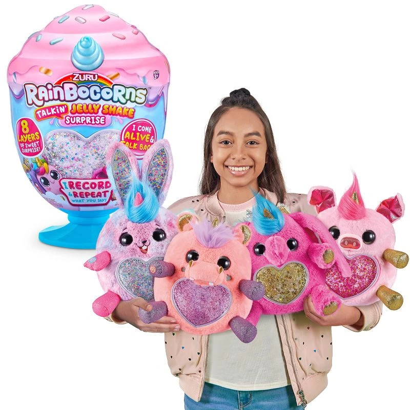 Nå klekkes det noe virkelig søtt igjen i Rainboville – det er nå 6 nye søte Rainbocorns plysjbamser som du kan samle! Rainbocorn’s Jelly Shake Surprise kombinerer Rainbocorns morsomme personligheter med en fantastisk utpakkingsopplevelse, og du kan lage din egen DIY Jelly shake. Når du åpner din nye store Rainbocorn Jelly Shake, finner du den søteste Rainbocorn med elektroniske funksjoner og interaksjoner. Den kan både spille lyder, den kan snakke og gjenta det du sier. Du vil også finne andre overraskelser i Jelly-shaken din, inkludert en søt boo-boocorn, og så kan du lage din egen deilige Jelly Shake.