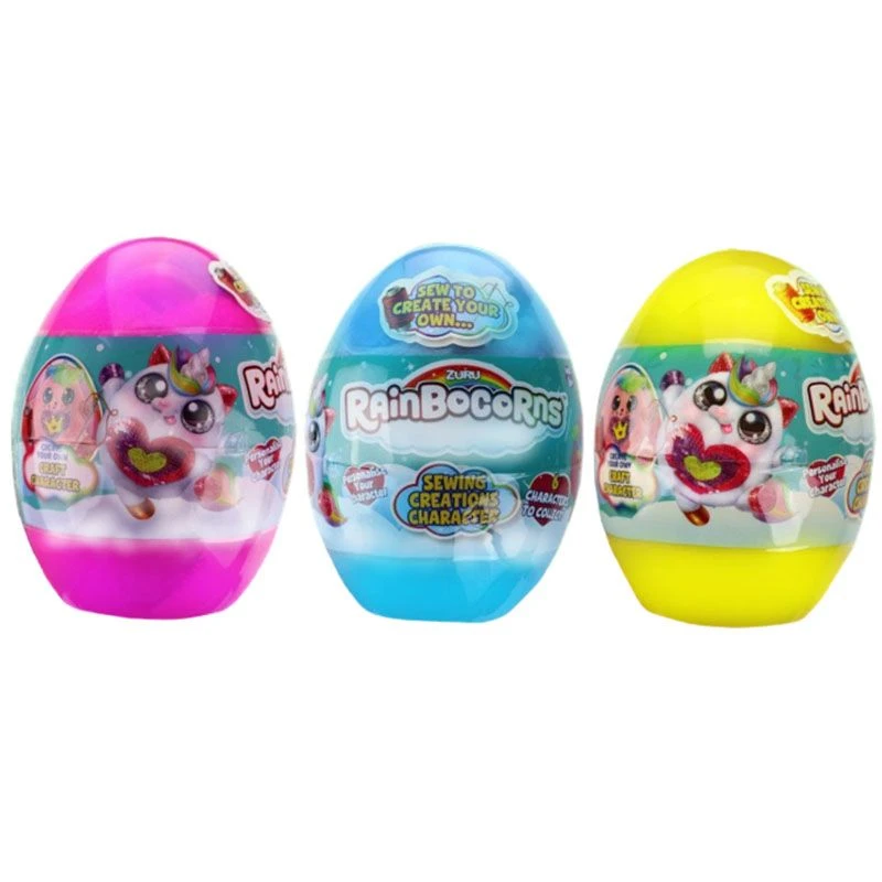 Sy sammen din egen Rainbocorns. Åpne esken å se hvilken enhjørning du får. Stapp bomullen inni, sy igjen hullet og på med vingene, og så er den klar for lek og morro.