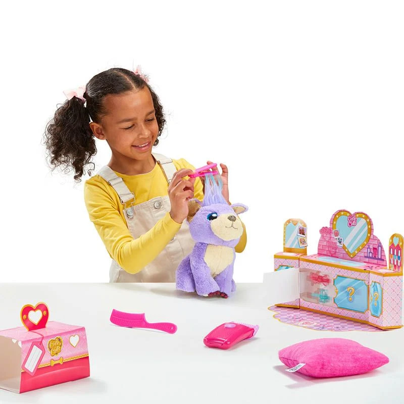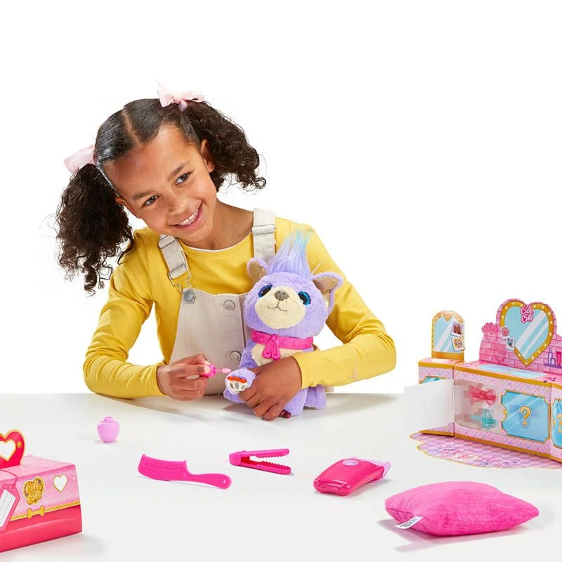 En komplett kjæledyrsalong med et søtt og bedårende Scruff A Luv plysjdyr! Ja, du kan til og med klippe pelsen! hvor fint kan du style den lilla hunden din? Start med å klippe valpen din, gi den et bad, vask, tørk og børst pelsen! Nå for den spesielle behandlingen; Mal neglene på potene, så styler og legger du til tilbehør – Ta daah !! WOW, du er så søt!